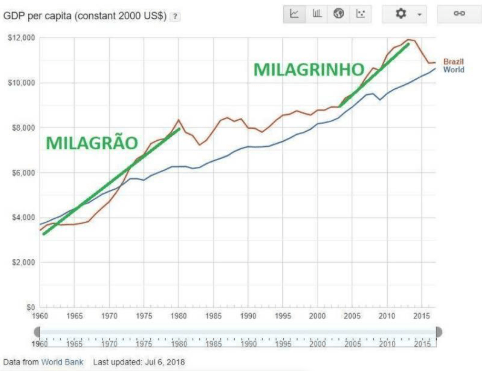 Resultado? O Brasil está com a mesma renda per capita de 1980 — $10.000 dólares. Quarenta anos estagnados.