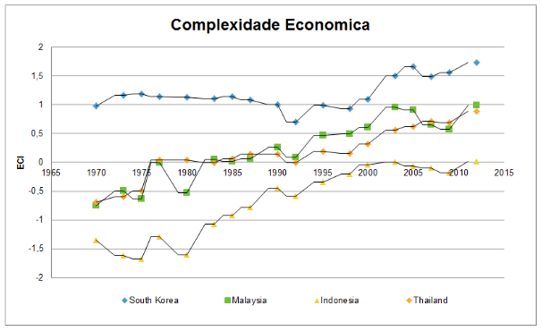 Complexidade econômica (1965–2015): os países do Sudeste Asiático subiram consistentemente na escala tecnológica, enquanto a América Latina ficou parada.