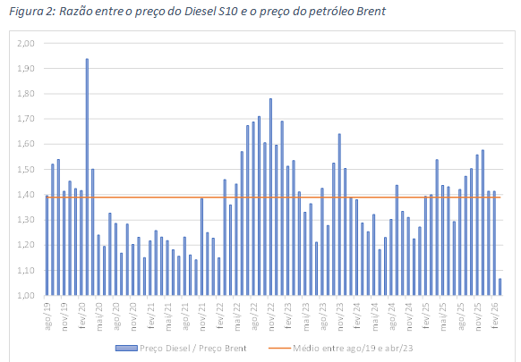 Depois da declaração do fim do PPI, desde maio de 2023, a relação entre o preço do Diesel e do petróleo Brent, foi, em média, de 1,37. Variou entre 1,07 e 1,64.