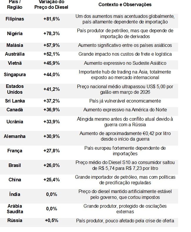 Para compreender a gravidade do momento e, ao mesmo tempo, identificar as possibilidades de ação soberana, é útil situar o Brasil no contexto internacional. A tabela abaixo consolida a variação do preço do diesel ao consumidor final em diversas economias desde o início do conflito, em 28 de fevereiro de 2026, até meados de março:
