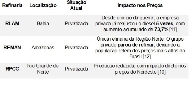 Tabela 3: Refinarias privatizadas e seus impactos nos preços
