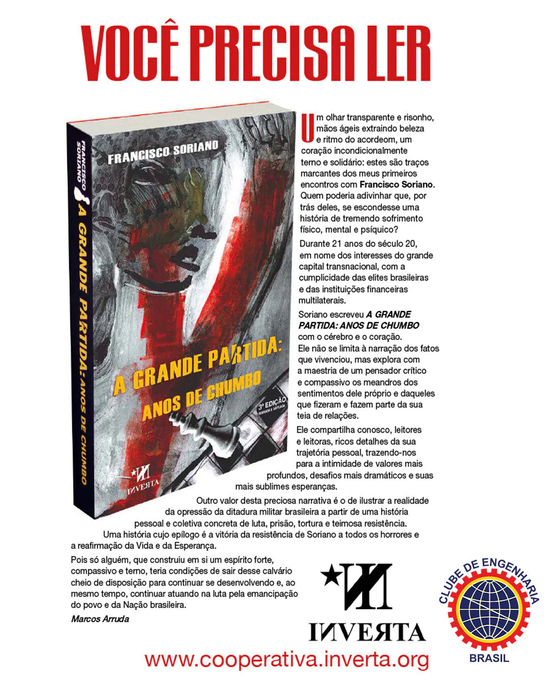 O livro “A Grande Partida: Anos de Chumbo“, do economista Francisco Soriano, celebra a chegada de sua 3ª edição ampliada, com novos personagens, capítulos e fotografias, em um evento de lançamento marcado para o dia 22 de outubro de 2025, das 16h30 às 19h30, no Clube de Engenharia do Brasil. A obra é um vigoroso romance revolucionário e narra as experiências do autor na luta aberta e clandestina contra a ditadura empresarial-militar no Brasil.